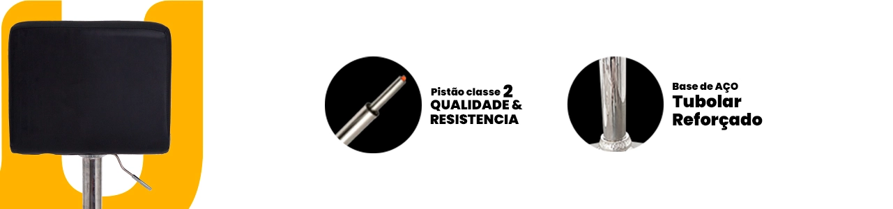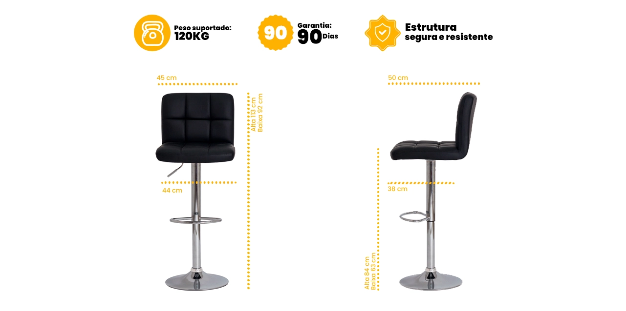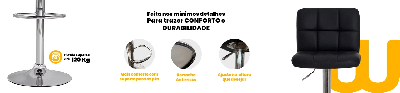 O assento estofado em PU (couro sintético) oferece conforto agradável ao uso diário, além de ser resistente e fácil de limpar. Já a base em aço cromado garante estabilidade, durabilidade e um acabamento sofisticado que se destaca na decoração.