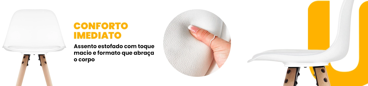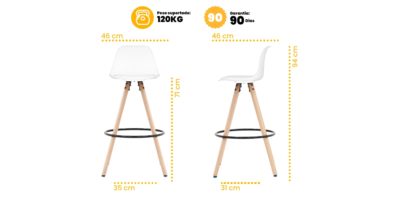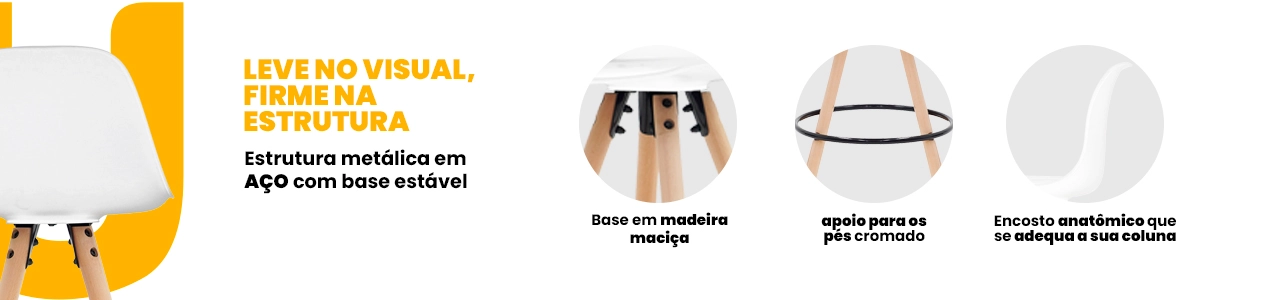 O assento em polipropileno estofado oferece conforto imediato, com toque macio e acabamento sofisticado. Já a base em madeira garante estabilidade, resistência e um charme natural que remete ao estilo escandinavo. O apoio para os pés em aro cromado complementa o design e proporciona mais ergonomia no uso diário.