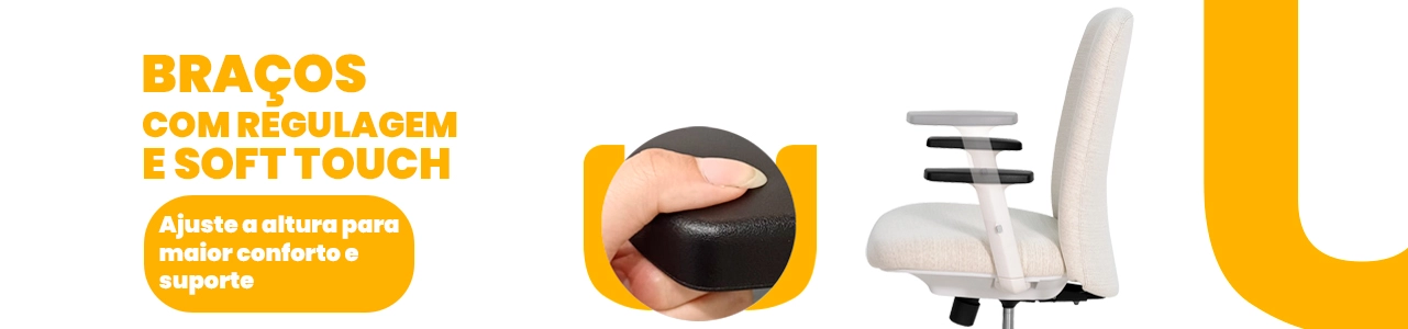 Os braços com ajuste de altura elevam o nível de ergonomia, proporcionando melhor apoio para ombros e braços ao longo do dia. A regulagem de altura do assento garante adaptação perfeita a diferentes usuários e estações de trabalho.