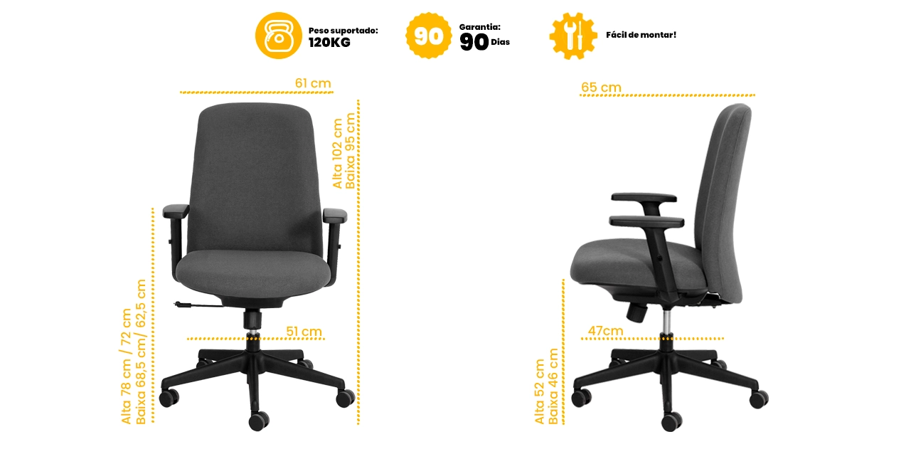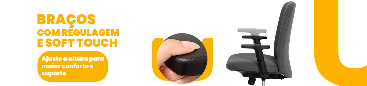 Os braços com ajuste de altura elevam o nível de ergonomia, proporcionando melhor apoio para ombros e braços ao longo do dia. A regulagem de altura do assento garante adaptação perfeita a diferentes usuários e estações de trabalho.