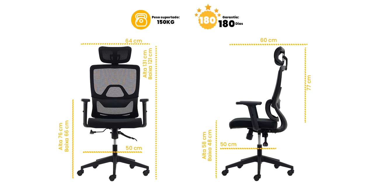 O encosto em tela mesh respirável mantém a ventilação constante, evitando acúmulo de calor e proporcionando maior bem-estar. Para uma experiência totalmente ajustável, a Ravena conta com regulagem de altura, além de apoio de cabeça e braços ajustáveis, permitindo adaptação perfeita a diferentes usuários e rotinas.