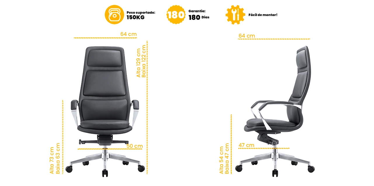 Seu assento e encosto integrados em peça única, produzidos em madeira, espuma e revestimento em courino, oferecem maciez, suporte adequado e acabamento sofisticado. O sistema de ajuste de altura com pistão a gás Classe 3 e o encosto reclinável com trava permitem personalizar a posição, garantindo postura correta e bem-estar ao longo do dia.