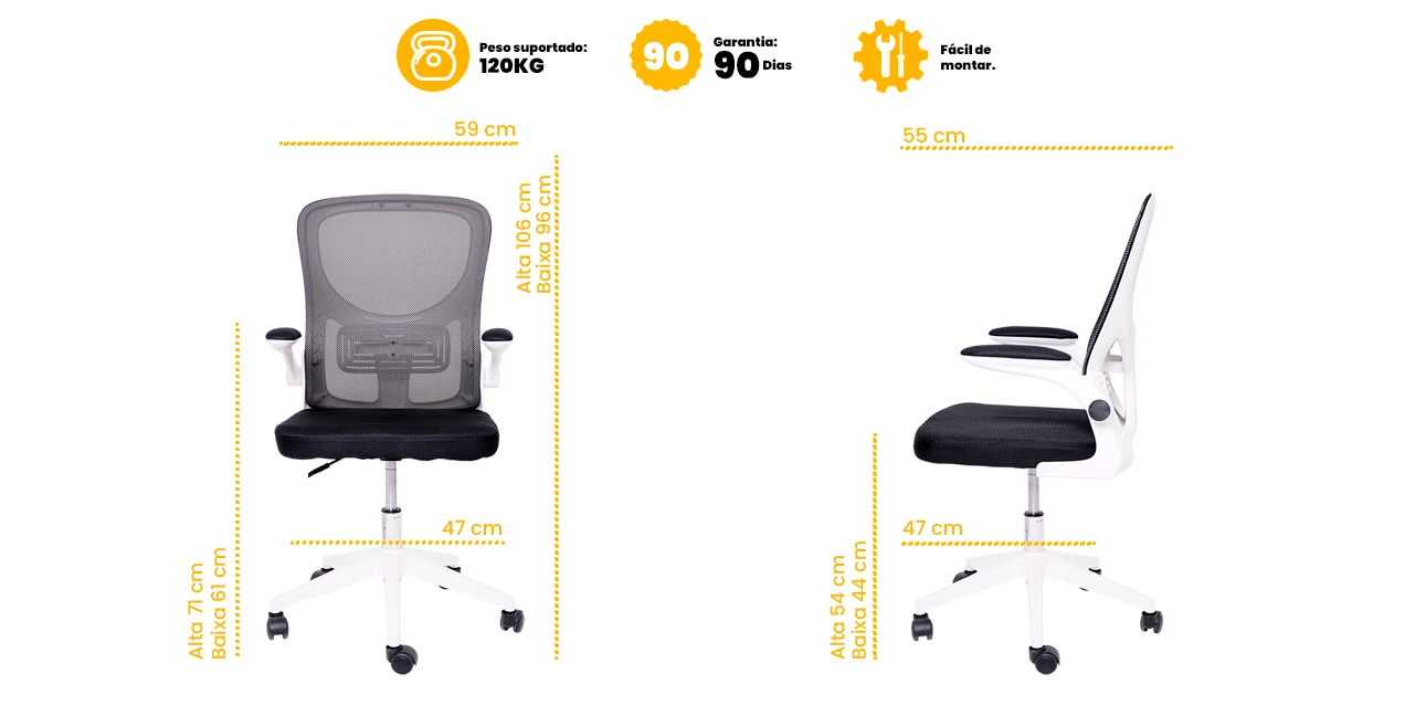 Seu encosto em mesh premium, firme e resistente, proporciona excelente ventilação, ajudando a manter o conforto térmico mesmo em uso prolongado.
