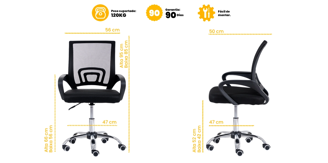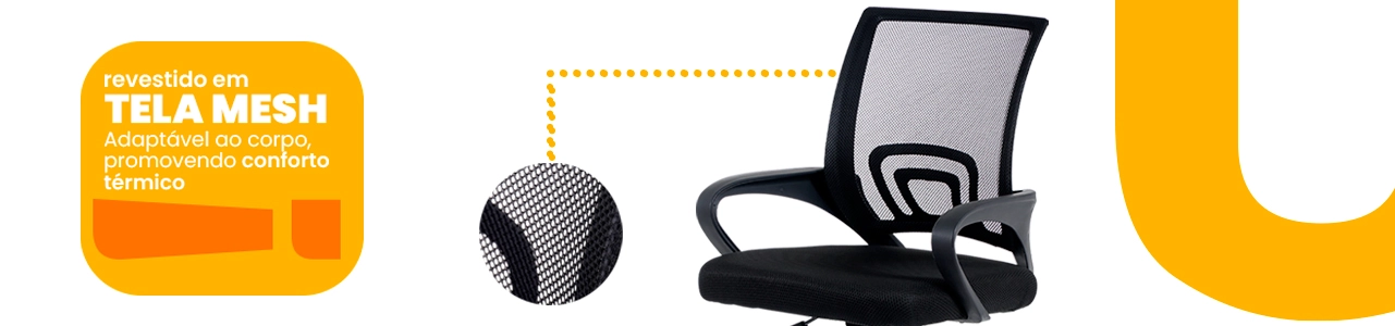 O encosto em tela mesh respirável favorece a circulação de ar, reduzindo o acúmulo de calor e garantindo mais conforto durante longos períodos de uso. O assento em madeira compensada com espuma D25, revestido em tecido, oferece apoio firme e confortável, ideal para rotinas de trabalho contínuas.