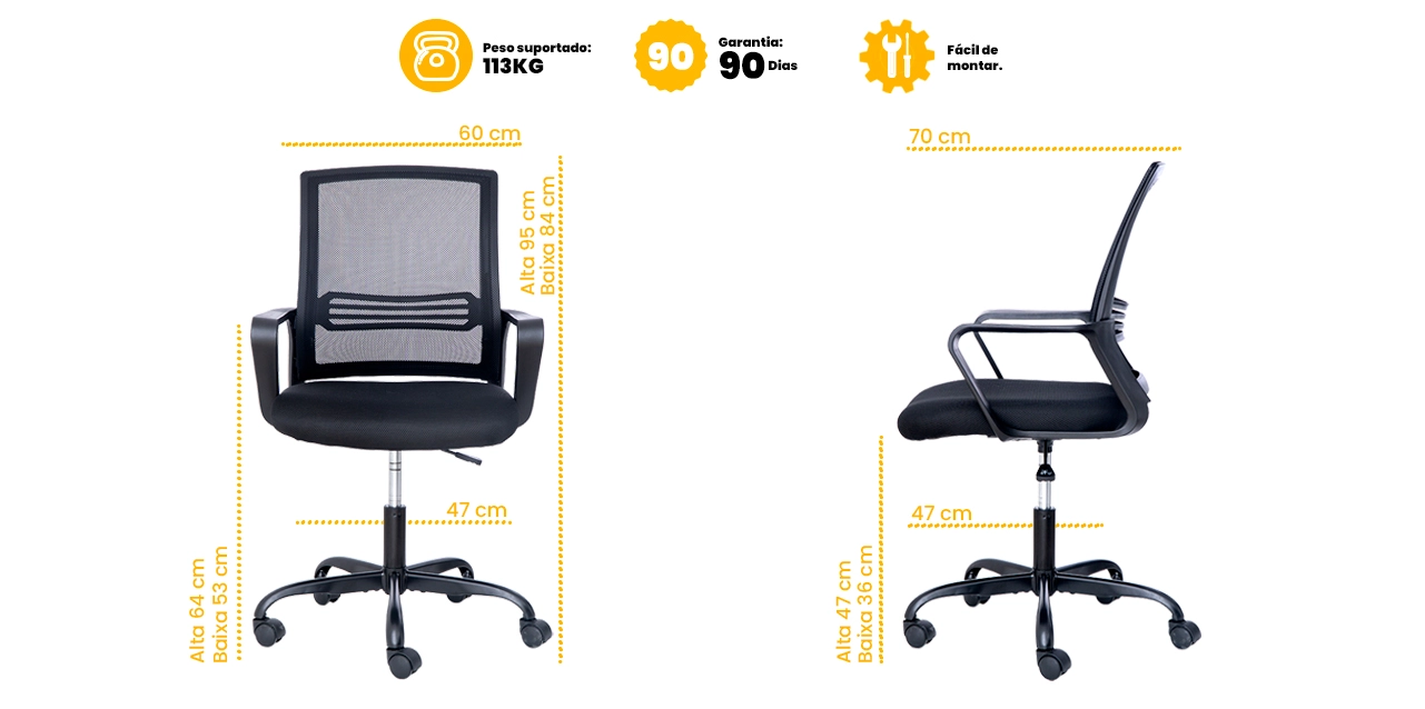 O assento com espuma de alta densidade D25, revestido em tela mesh respirável, garante conforto térmico e suporte adequado mesmo durante longos períodos de uso. A estrutura foi pensada para oferecer postura correta e bem-estar contínuo, reduzindo o cansaço ao longo do dia.