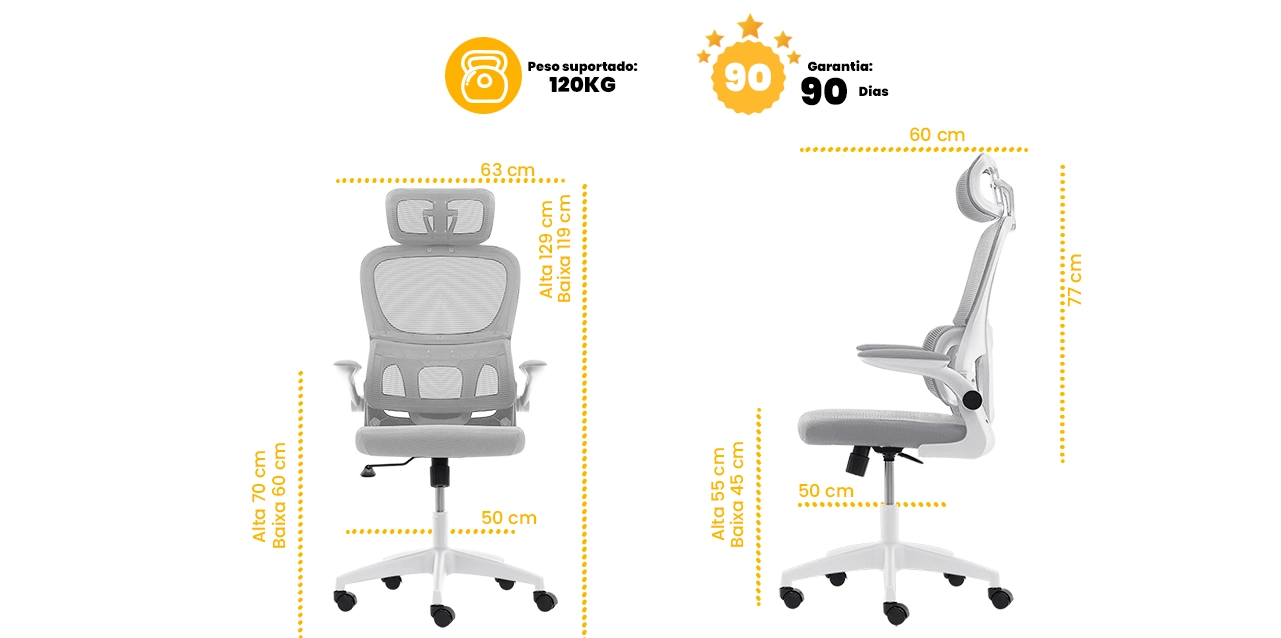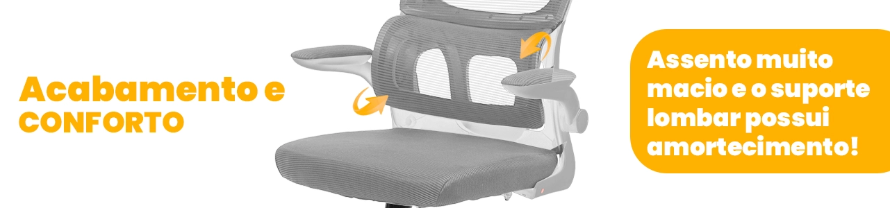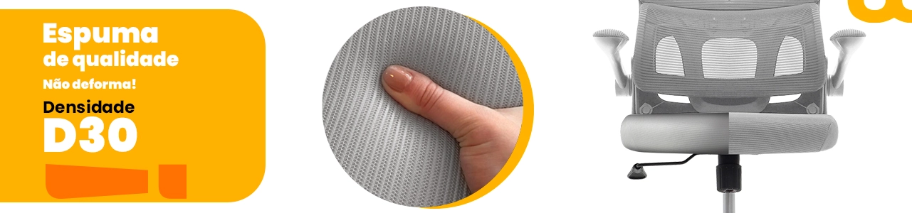 O encosto ergonômico em tela Mesh respirável se adapta às curvas naturais do corpo, garantindo ventilação contínua e maior conforto térmico. O assento com espuma de alta densidade D30 oferece firmeza e bem-estar mesmo em longas jornadas.