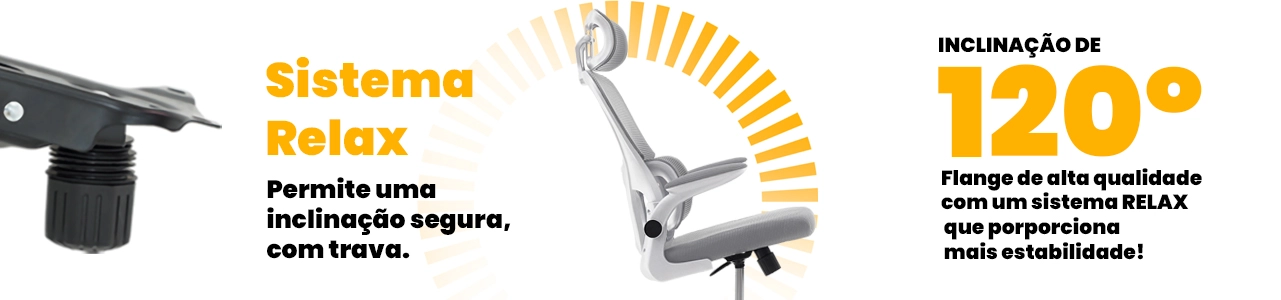 Conta com sistema de inclinação Flange com função Relax e trava, permitindo alternar entre foco e descanso com segurança. Possui ajuste de altura, assento giratório 360° e rodízios anti-risco, proporcionando mobilidade suave sem danificar o piso.