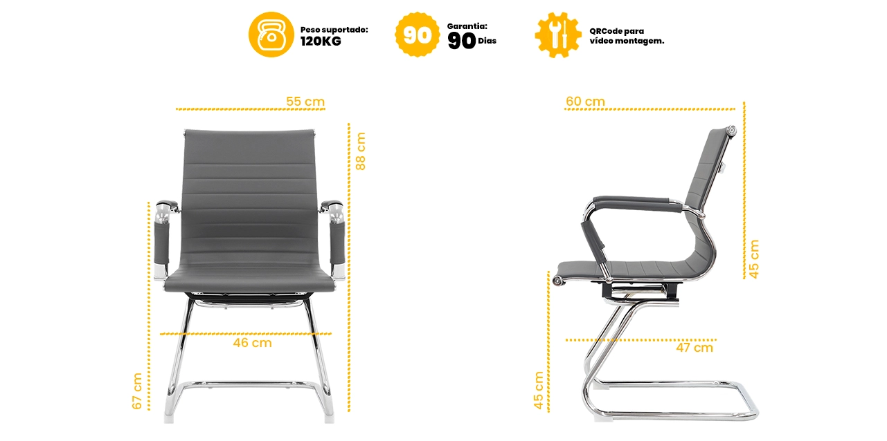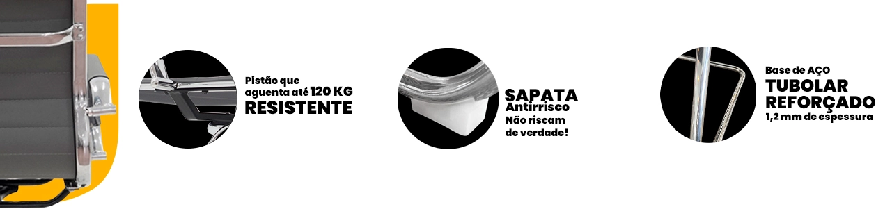 A estrutura reforçada, aliada à base em aço cromado, proporciona estabilidade, resistência e longa vida útil, mantendo o visual moderno e profissional ao longo do tempo.