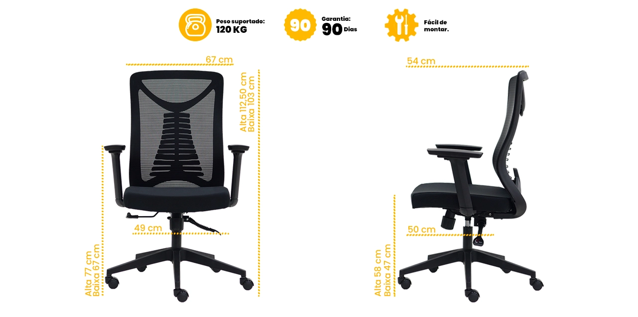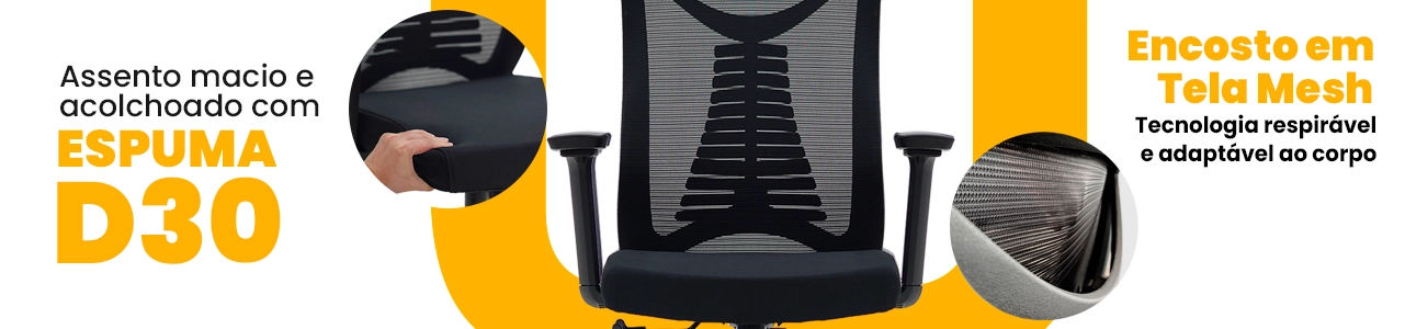O assento com espuma de alta densidade D30, revestido em tecido, oferece conforto firme, excelente sustentação e alta durabilidade. Já o encosto em tela Mesh garante ventilação constante, mantendo o corpo mais fresco ao longo do uso.