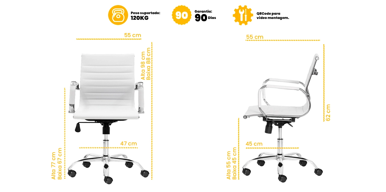 O assento e encosto em peça única, revestidos em PU de alta qualidade, proporcionam toque macio, fácil limpeza e excelente suporte para a coluna, garantindo postura correta e conforto prolongado mesmo após longas jornadas de trabalho.