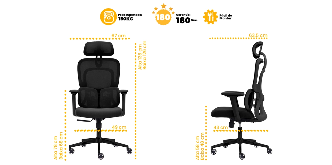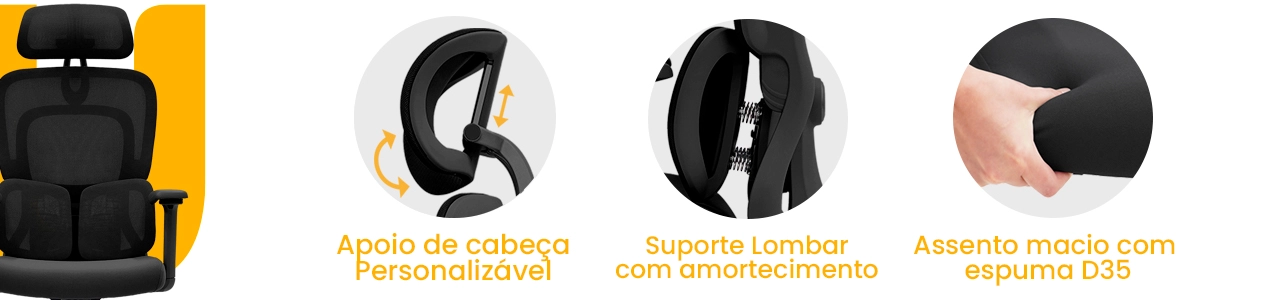 Os braços articulados 4D permitem ajuste completo, proporcionando personalização total para diferentes biotipos e rotinas. Já o encosto em tela mesh respirável mantém a ventilação constante, evitando o acúmulo de calor e aumentando o bem-estar.