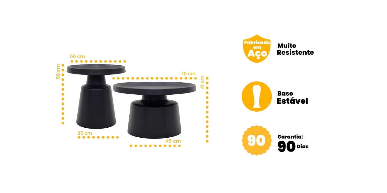 O produto é comercializado em pares do mesmo acabamento, com opções de par na cor preta ou par na cor branca, permitindo escolher a versão que melhor se adapta ao estilo do ambiente. A composição em dois tamanhos cria um jogo de alturas elegante, que valoriza a decoração e otimiza o espaço.