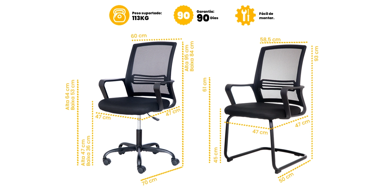 As cadeiras contam com assento em espuma D25 e revestimento em tela mesh respirável, garantindo conforto térmico e suporte adequado para longas jornadas. A Ever Bhutan possui regulagem de altura, base giratória e rodízios, enquanto as versões fixas oferecem maior estabilidade.