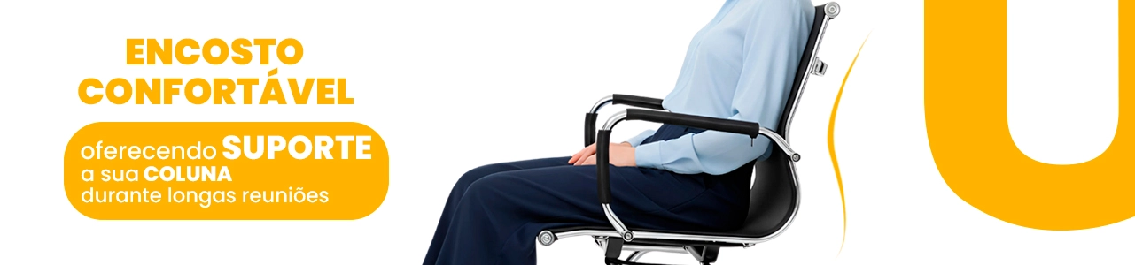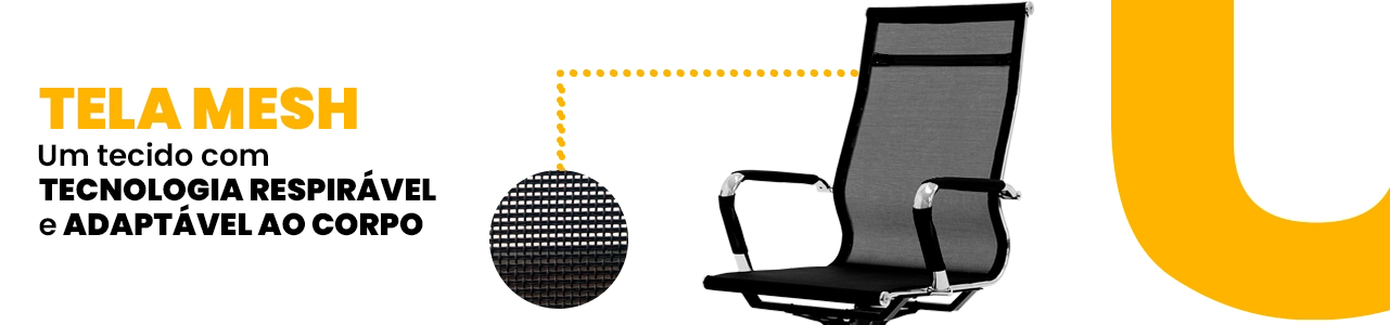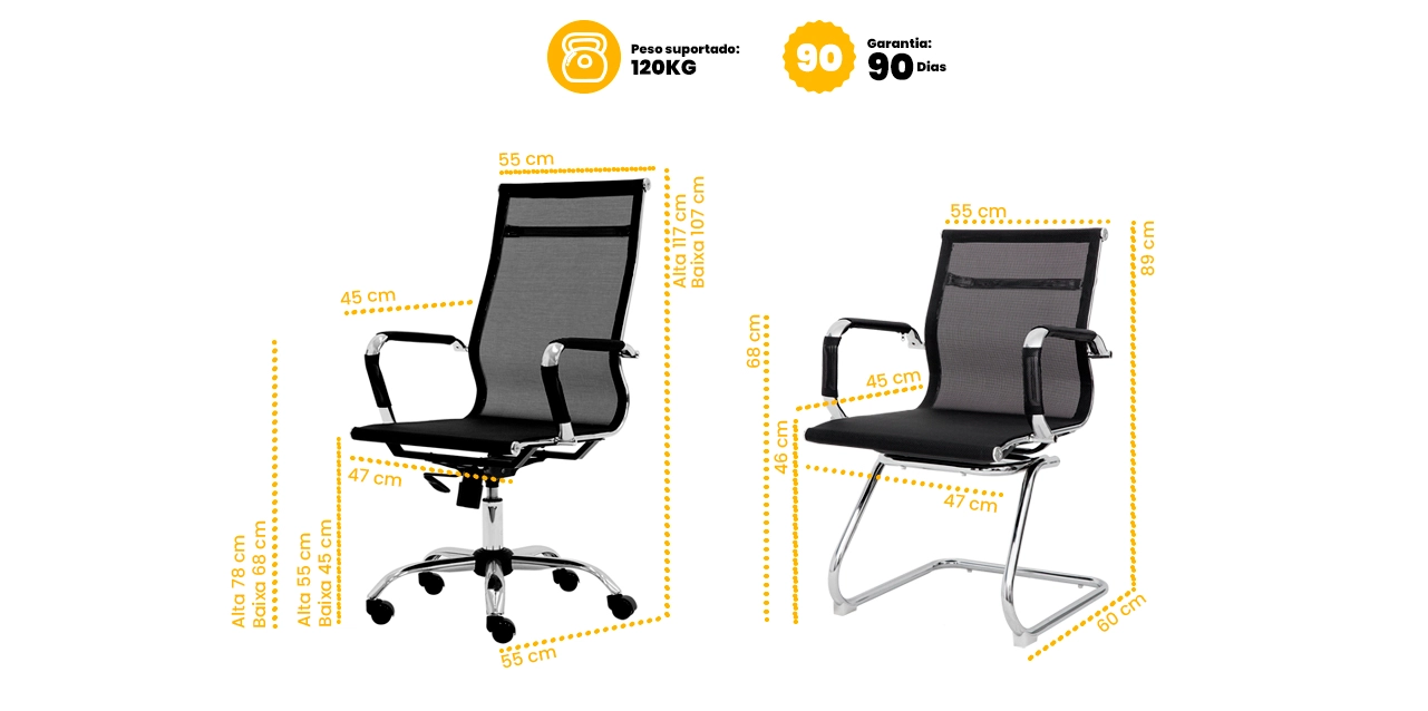 As cadeiras contam com encosto em tela mesh respirável, que melhora a ventilação e auxilia na postura correta durante longas jornadas. A versão Presidente possui ajuste de altura, giro 360° e rodízios, enquanto as Diretoras apresentam estrutura fixa com braços integrados.
