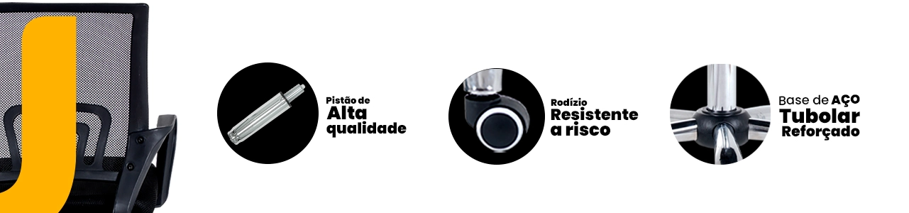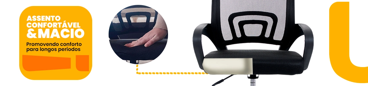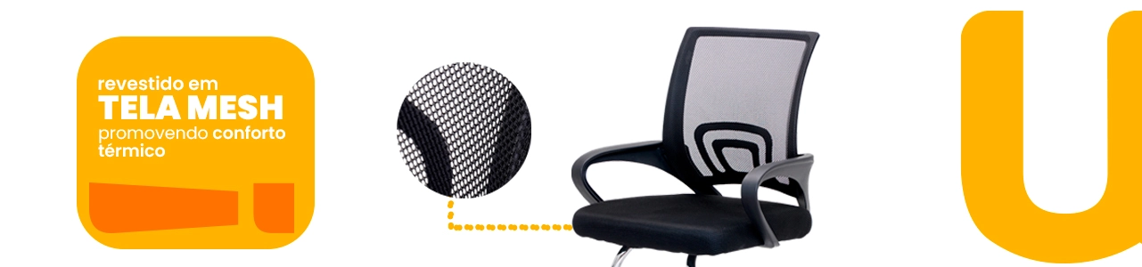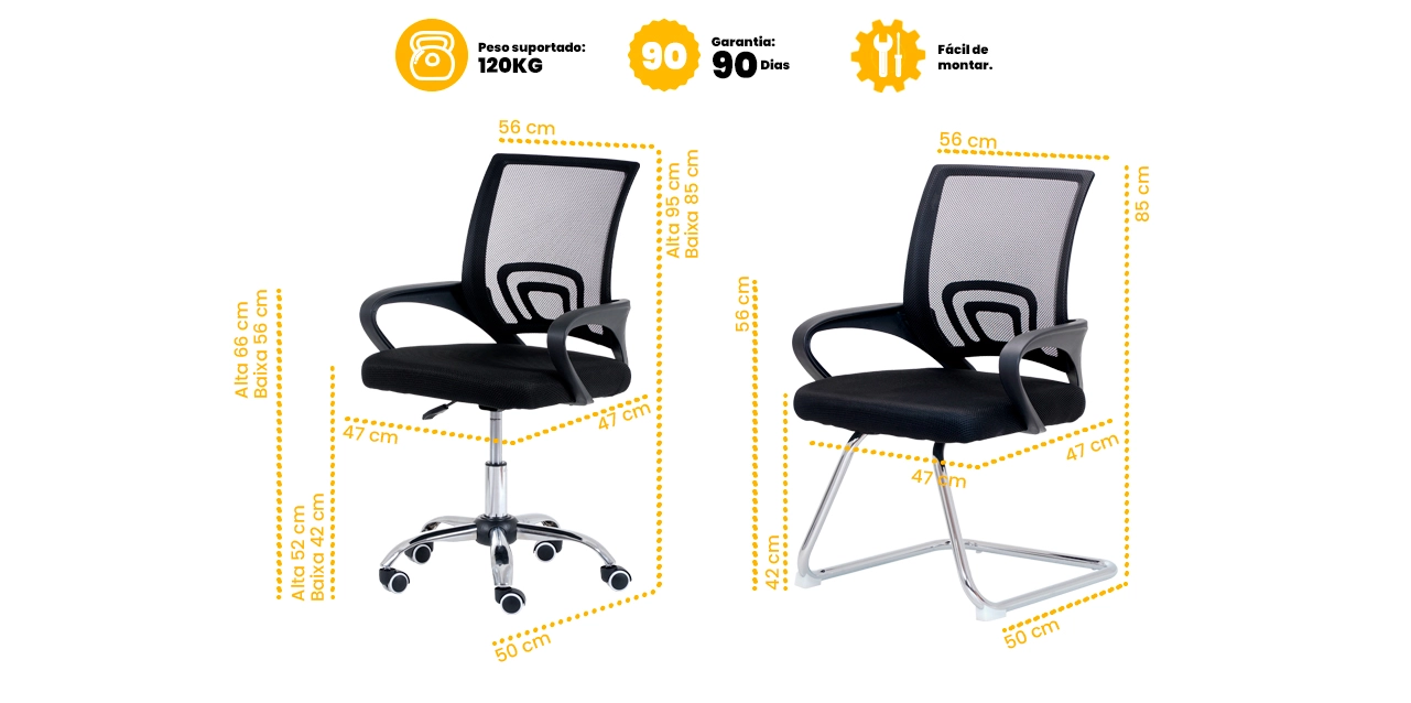 Os modelos contam com encosto em tela mesh respirável, que melhora a ventilação e garante conforto durante longas jornadas. As cadeiras fixas proporcionam estabilidade e segurança, enquanto a versão giratória possui ajuste de altura por pistão a gás para maior praticidade.