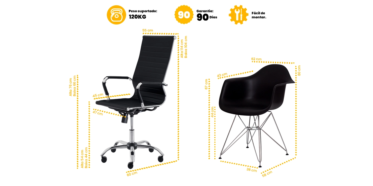 A Stripes Presidente possui assento e encosto em PU de alta qualidade, com ajuste de altura e sistema Relax, garantindo conforto prolongado e postura adequada. As Eiffel Eames contam com assento em polipropileno anatômico e base cromada, unindo leveza, resistência e elegância.