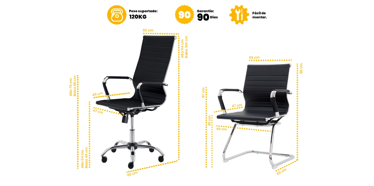 As estruturas reforçadas com base em aço cromado asseguram estabilidade, resistência e acabamento moderno, sendo ideais para escritórios, salas de reunião, salas de espera e espaços executivos.