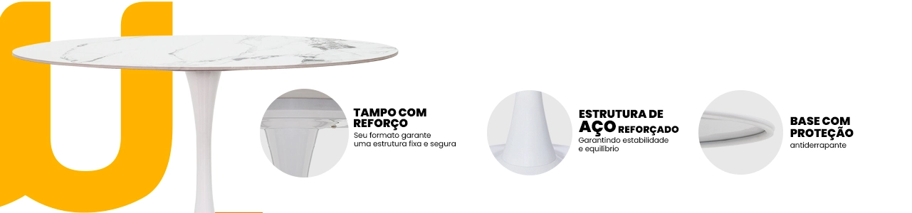 Seu design com base central em aço pintado, sem pernas tradicionais, oferece maior liberdade para acomodar cadeiras de diversos estilos, otimizando o espaço e valorizando o ambiente com um visual clean e moderno.
