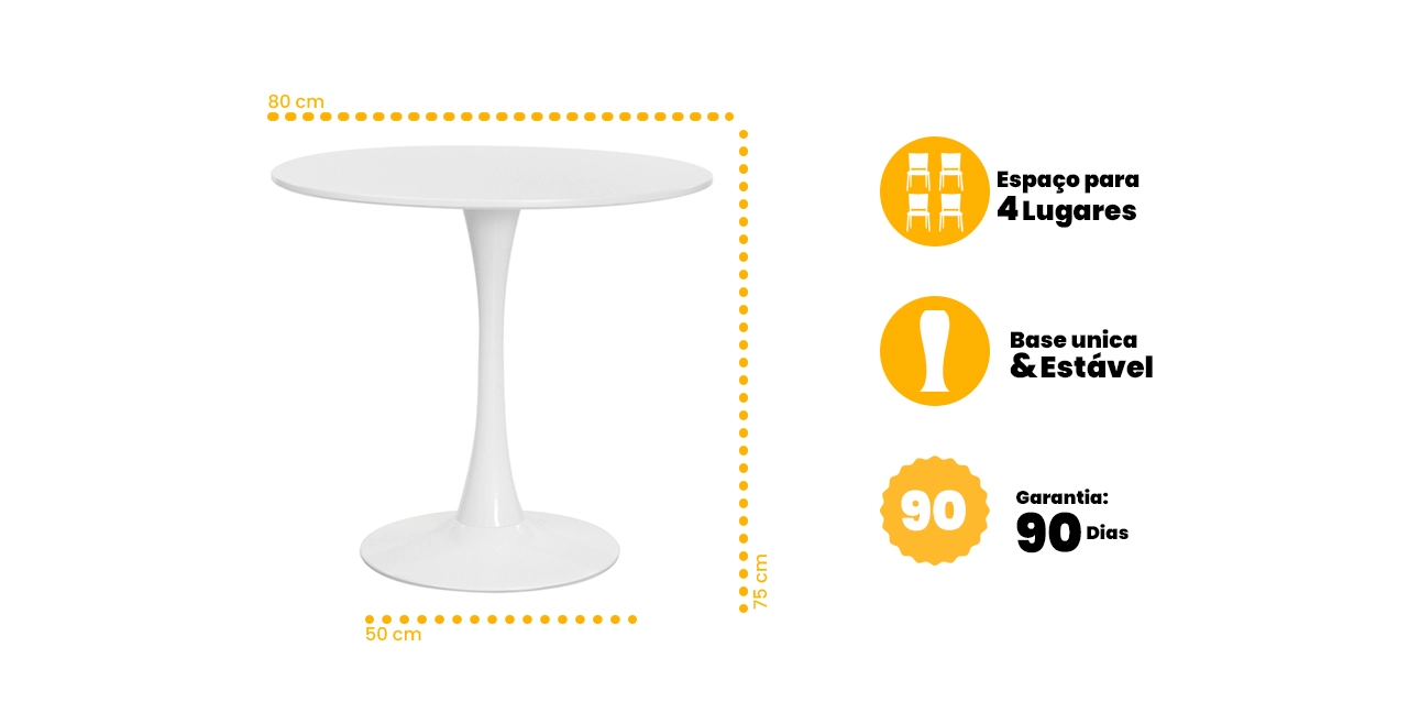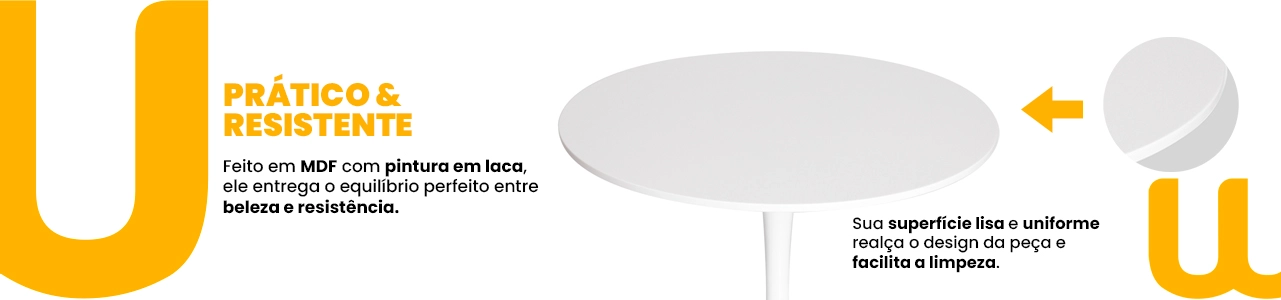 Seu tampo redondo em MDF com acabamento em tinta laca oferece superfície lisa, visual refinado e fácil limpeza, valorizando ambientes residenciais ou corporativos.