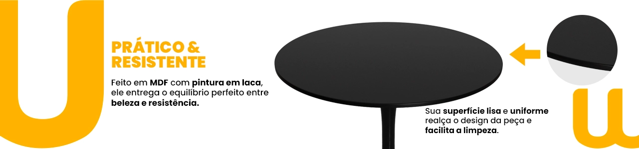 Seu tampo redondo em MDF com acabamento em tinta laca oferece superfície lisa, visual refinado e fácil limpeza, valorizando ambientes residenciais ou corporativos.