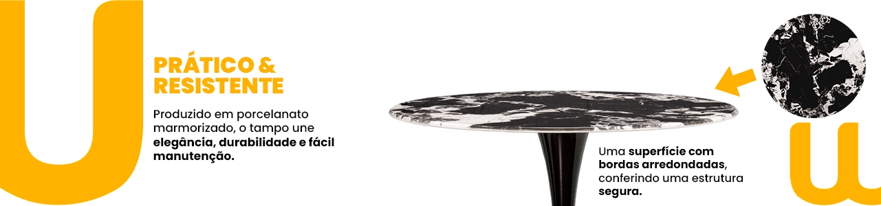 Seu tampo redondo em Porcelanato com acabamento em Mármore oferece superfície lisa, visual refinado e fácil limpeza, valorizando ambientes residenciais ou corporativos.