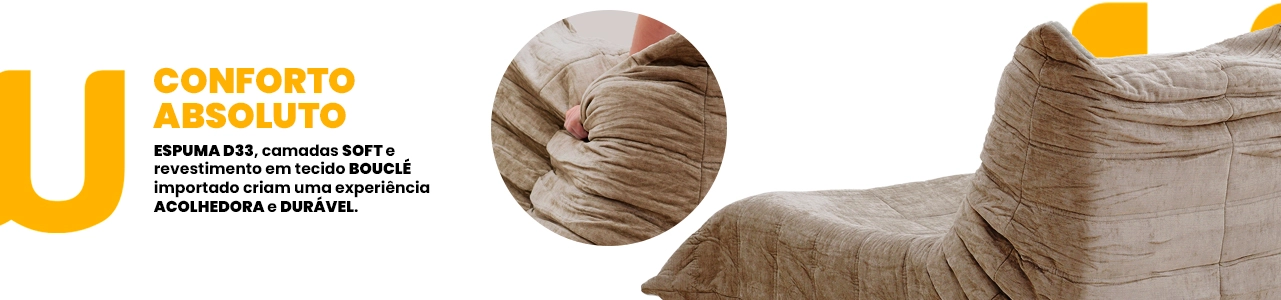 Produzida com materiais premium, combina espumas de alta densidade e camadas soft para oferecer conforto profundo e durabilidade. O revestimento em tecido bouclé acrescenta textura, aconchego e sofisticação, enquanto a estrutura interna reforçada garante estabilidade no uso diário.