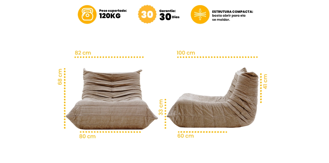 Atenção: após abrir a poltrona, é necessário aguardar até 24 horas para que o enchimento expanda totalmente e o produto atinja sua forma e conforto ideais. Esse processo é natural e faz parte da experiência do produto.