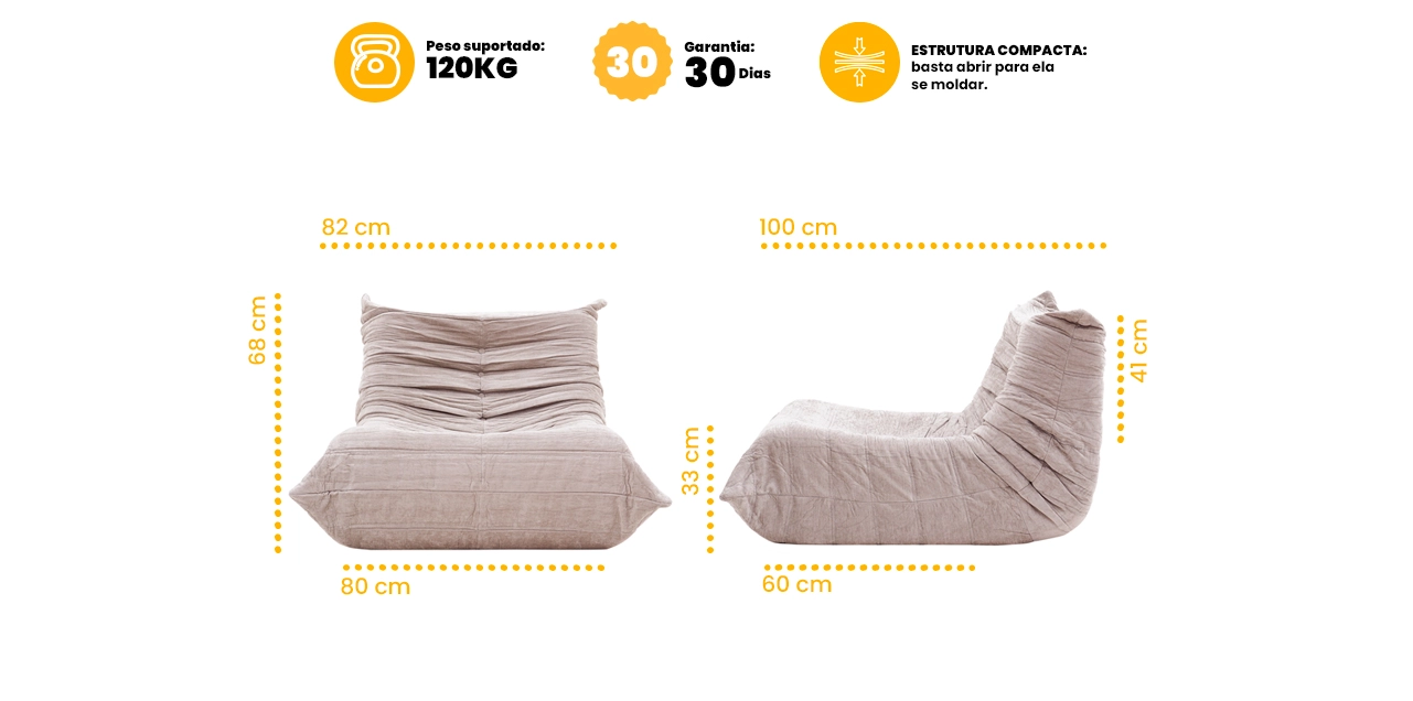Atenção: após abrir a poltrona, é necessário aguardar até 24 horas para que o enchimento expanda totalmente e o produto atinja sua forma e conforto ideais. Esse processo é natural e faz parte da experiência do produto.