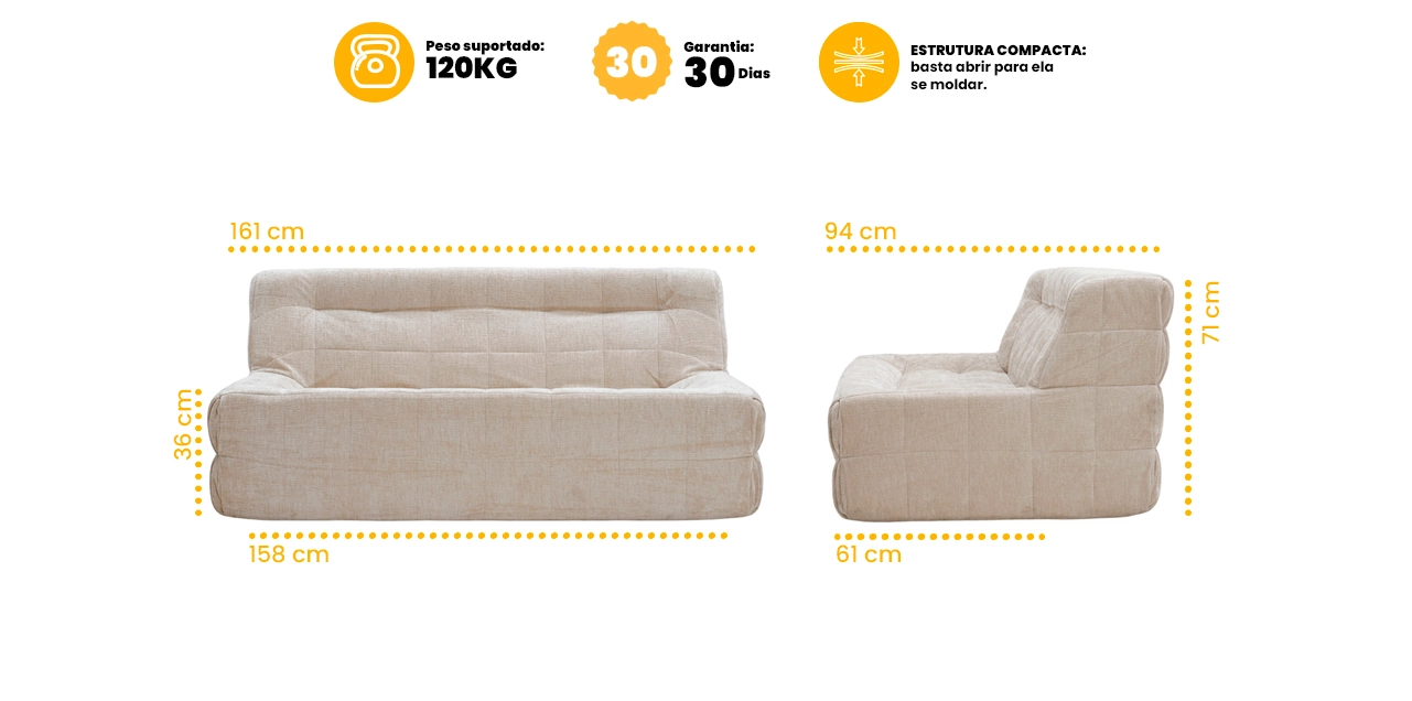 Atenção: após abrir a poltrona, é necessário aguardar até 24 horas para que o enchimento expanda totalmente e o produto atinja sua forma e conforto ideais. Esse processo é natural e faz parte da experiência do produto.